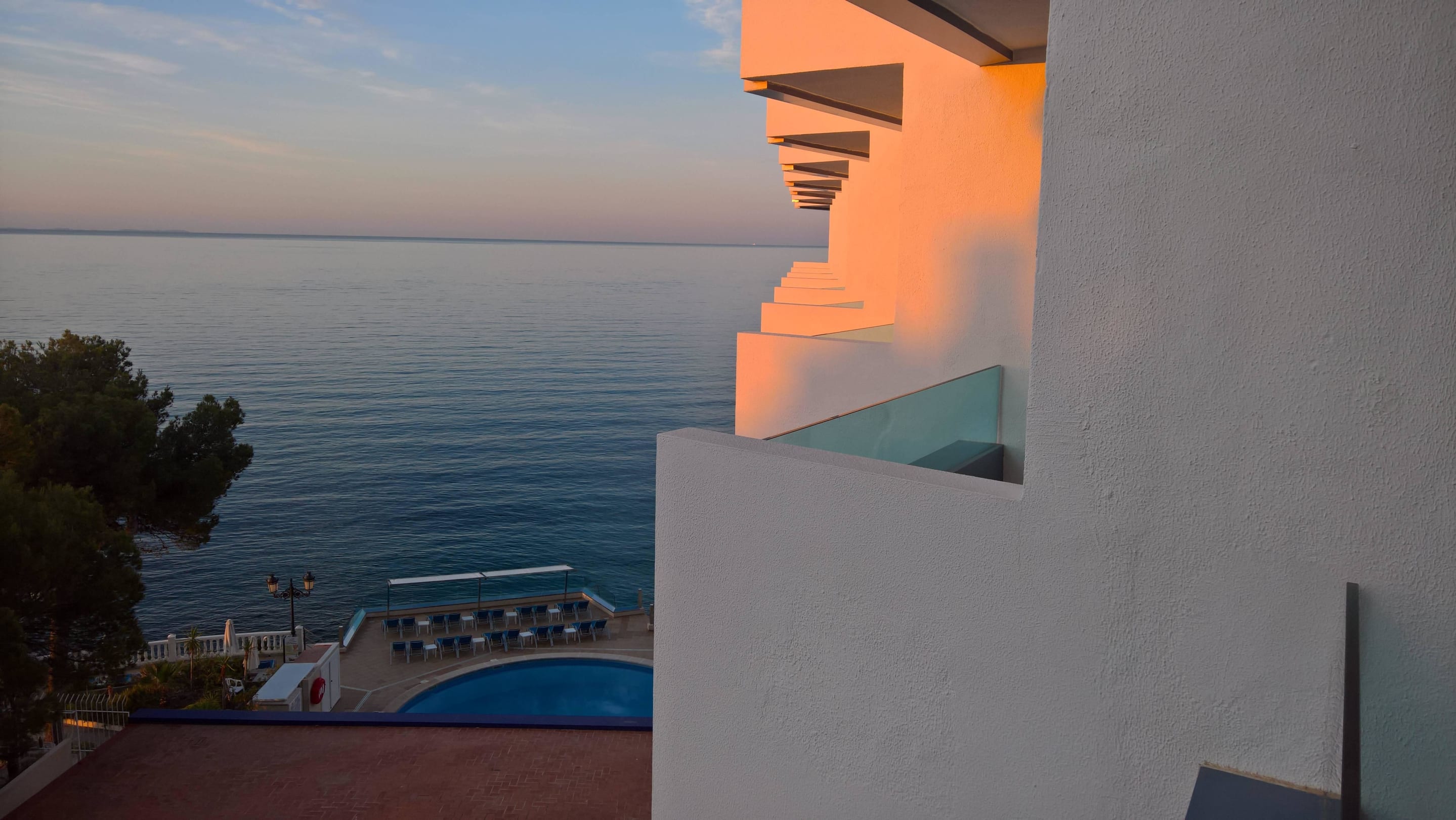 Blick am Morgen auf Pool und Meer