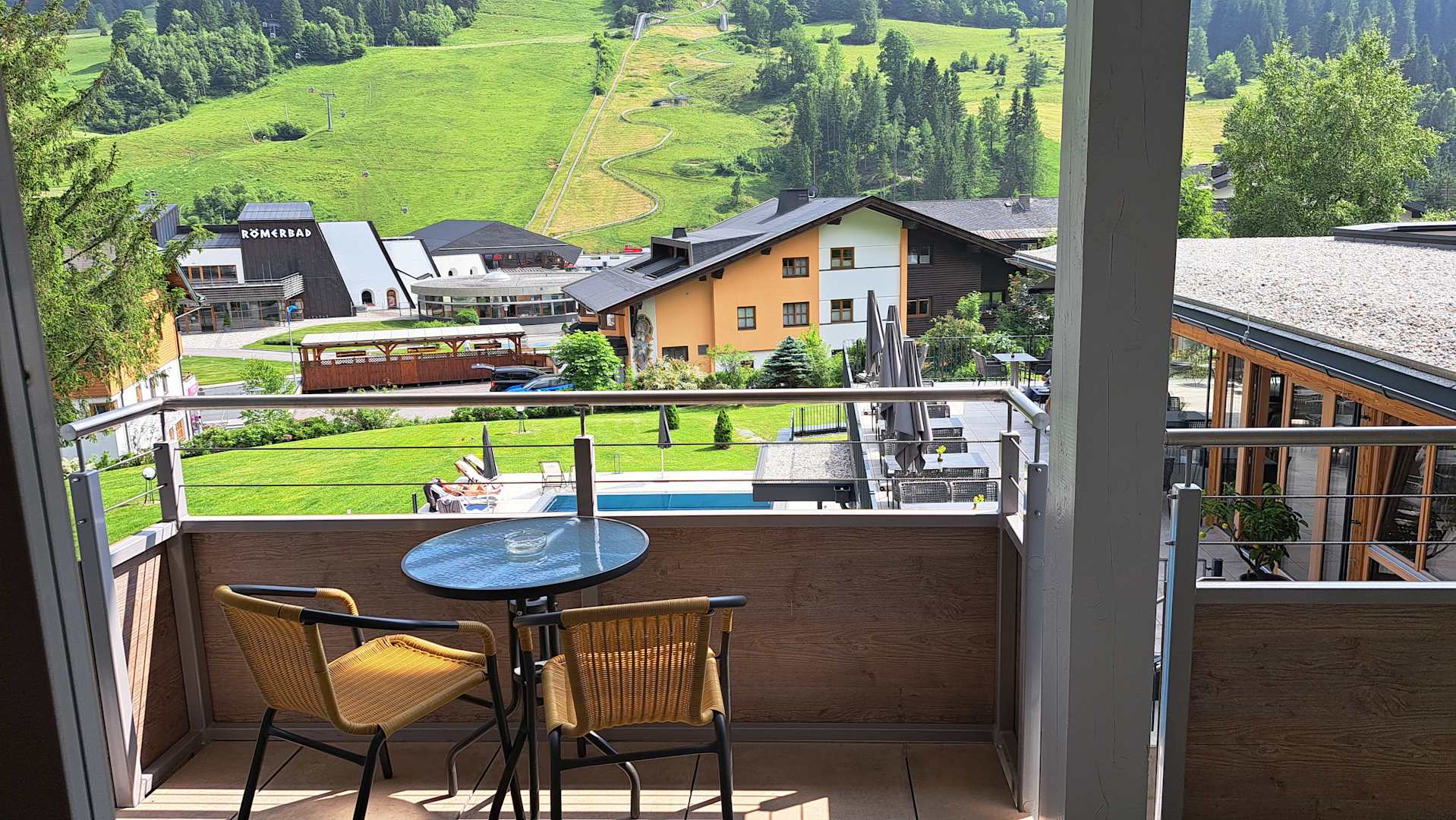 Unser großer Balkon mit Blick auf den Pool und die Kaiserburgbahn