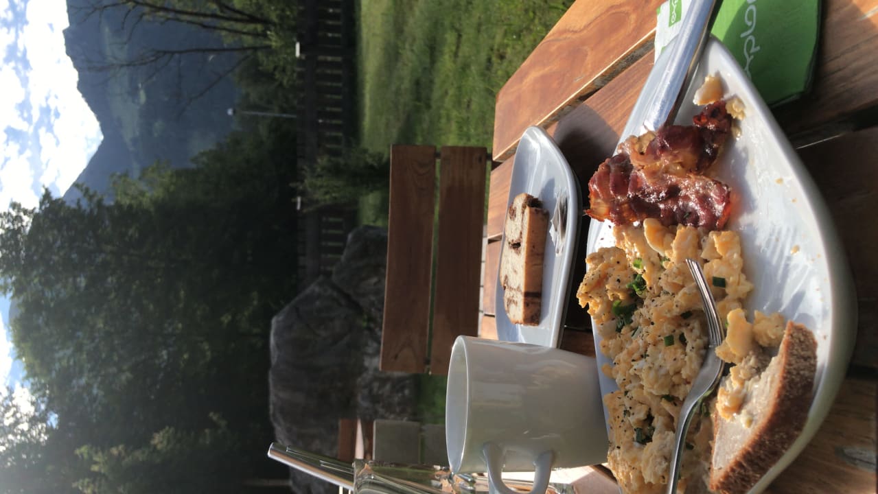Leckeres Frühstück und man kann bei gutem Wetter auf der Terasse sitzen 😊