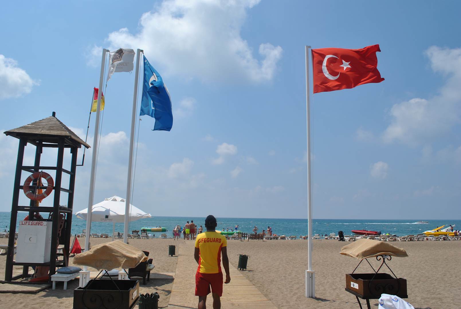 StrandRechts und links stehen die Behälter zur Abgabe von Teller, Bechern etc. Es wurde aber auch permanent an den Liegen eingesammelt.