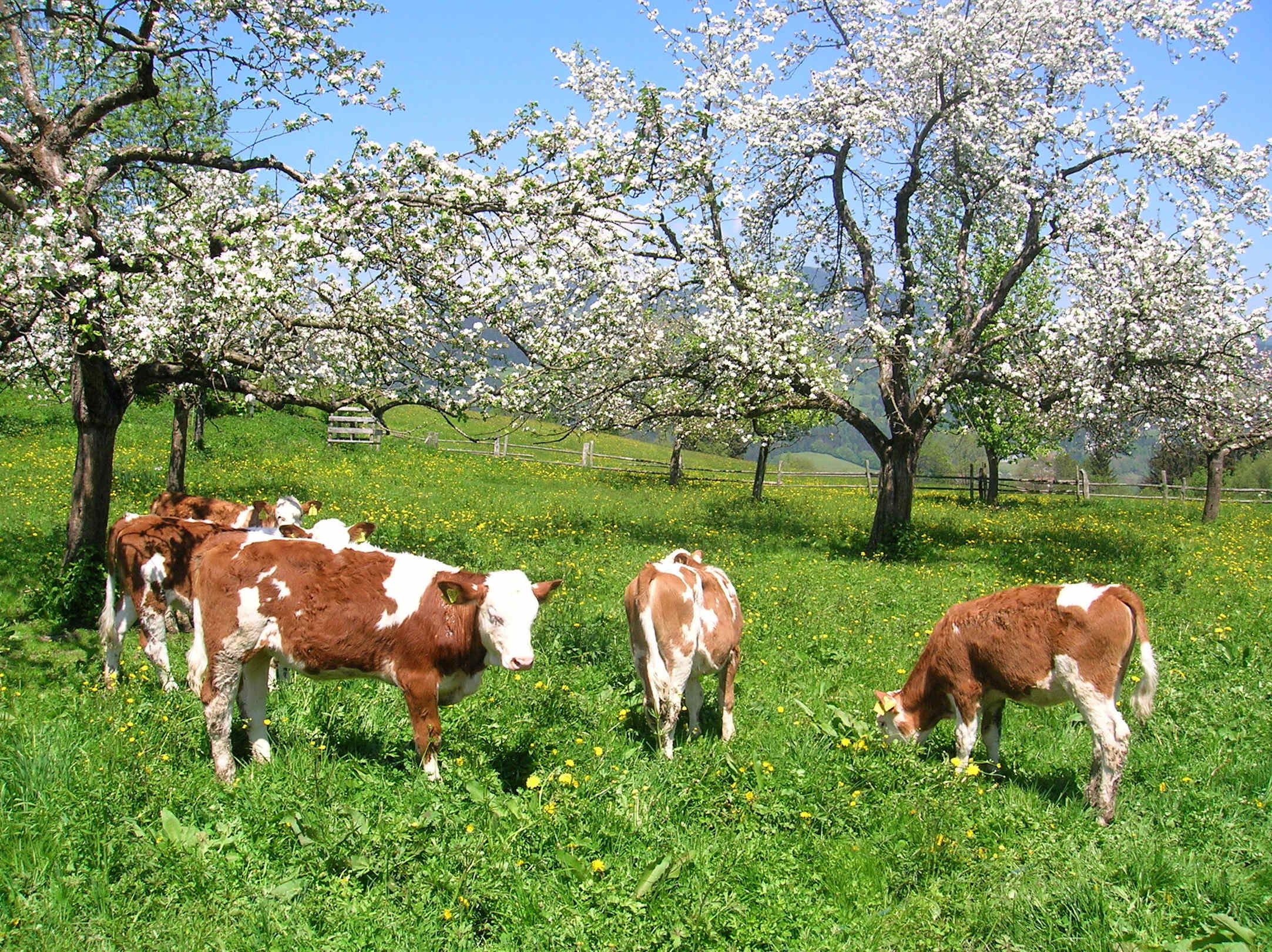Kälber im blühenden Obstgarten