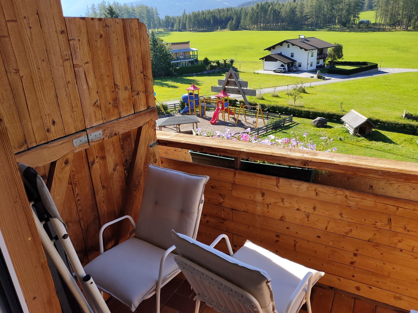 Der Balkon war etwas klein. Wir hatten Sicht auf den hoteleigenen Spielplatz und den Garten.