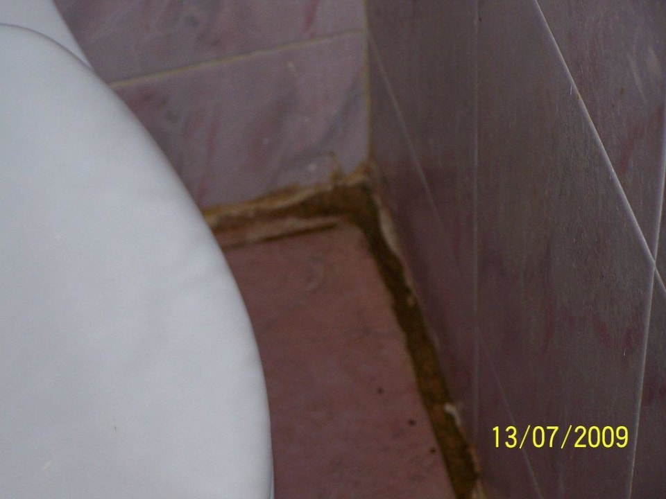 Schimmelecke im Bad an der wackelden Toilette, Wasser tritt aus