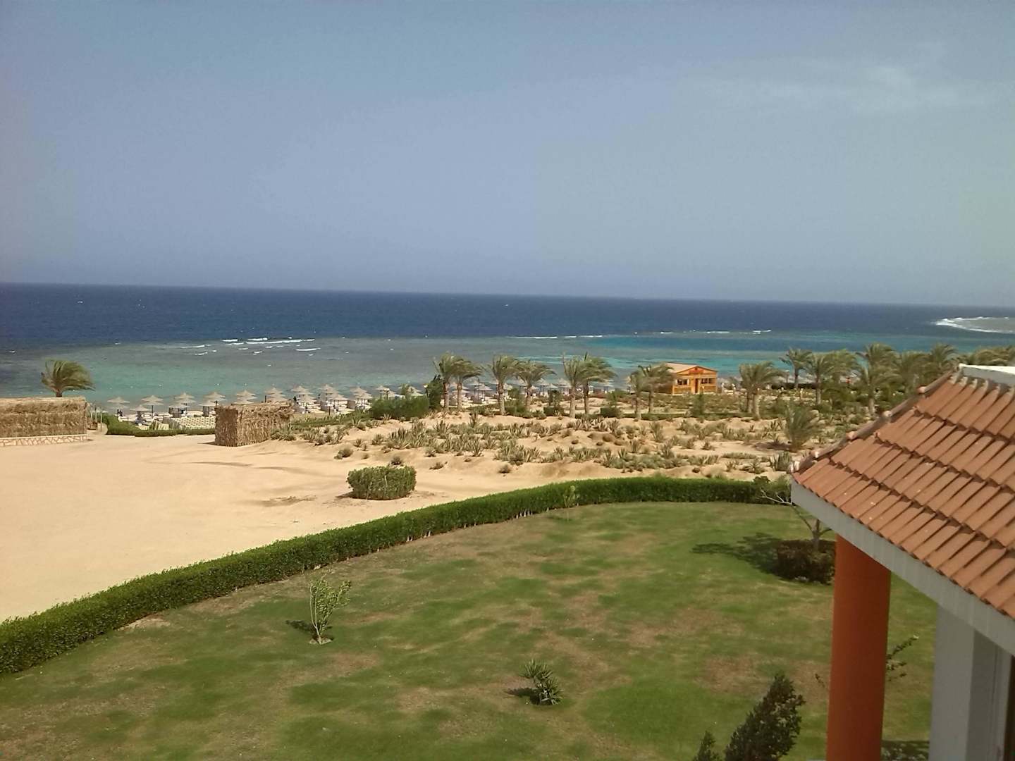 Blick vom Dach auf den Strand und das Rote Meer