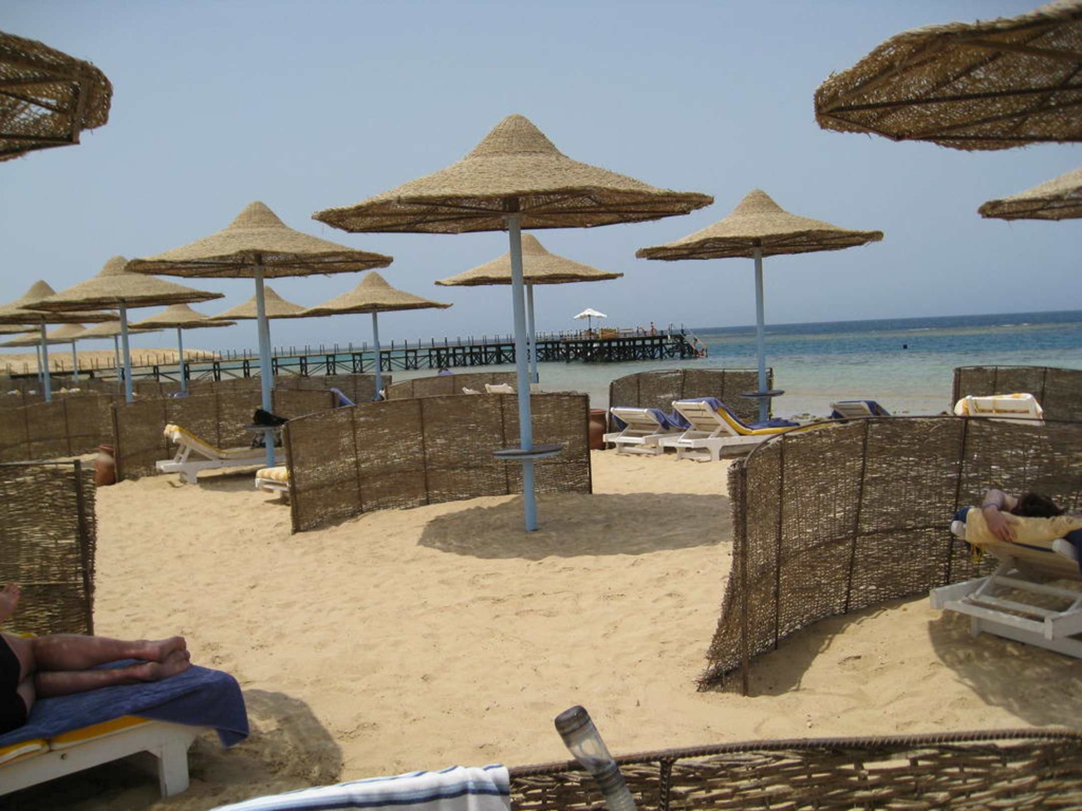 Der Hotel StrandHinten sieht man den Steg, der den einen Wassereinstieg darstellt. Der andere befindet sich links am Strand ohne Steg.