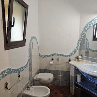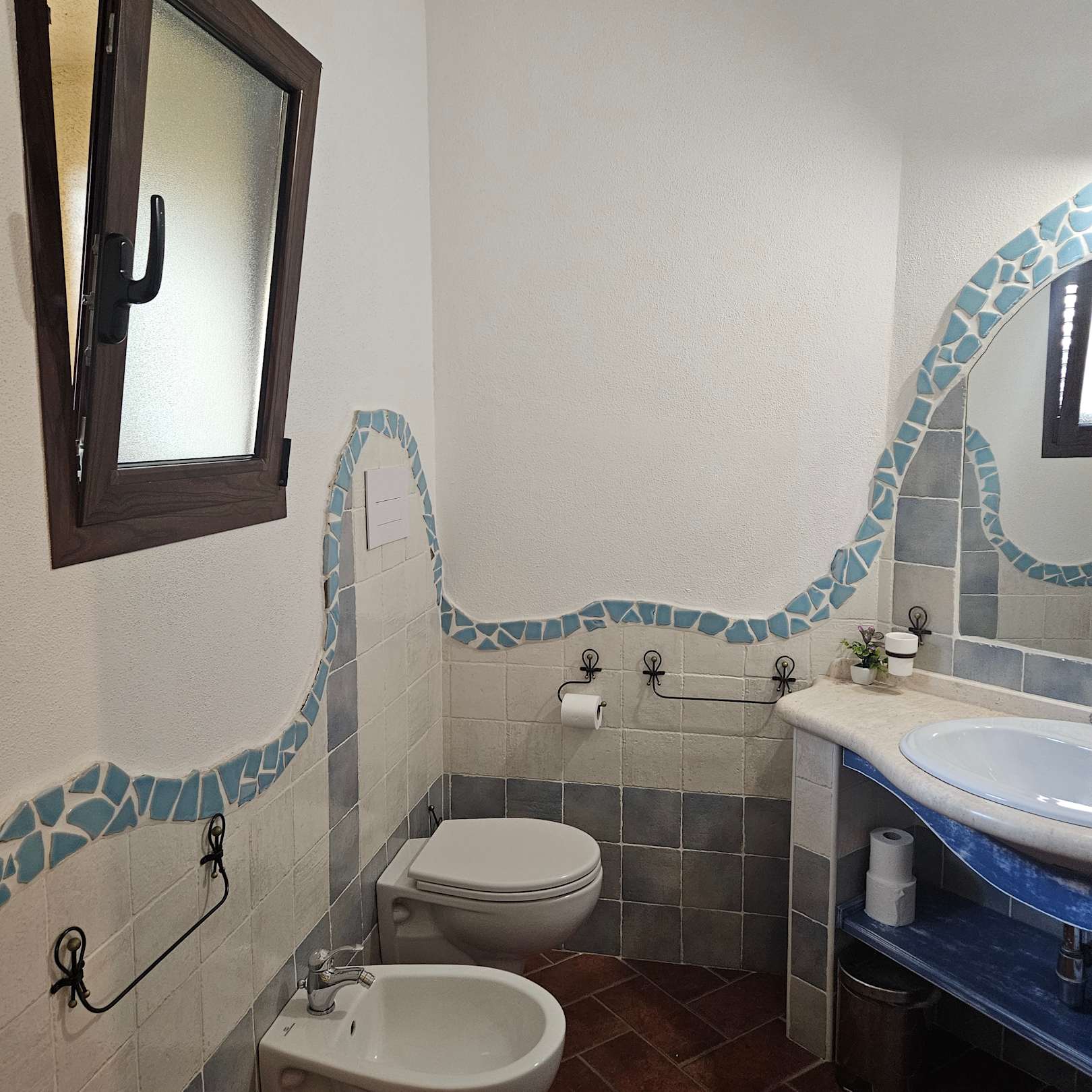 Badezimmer mit WC, Bidet, Dusche und viel Ablagemöglichkeiten