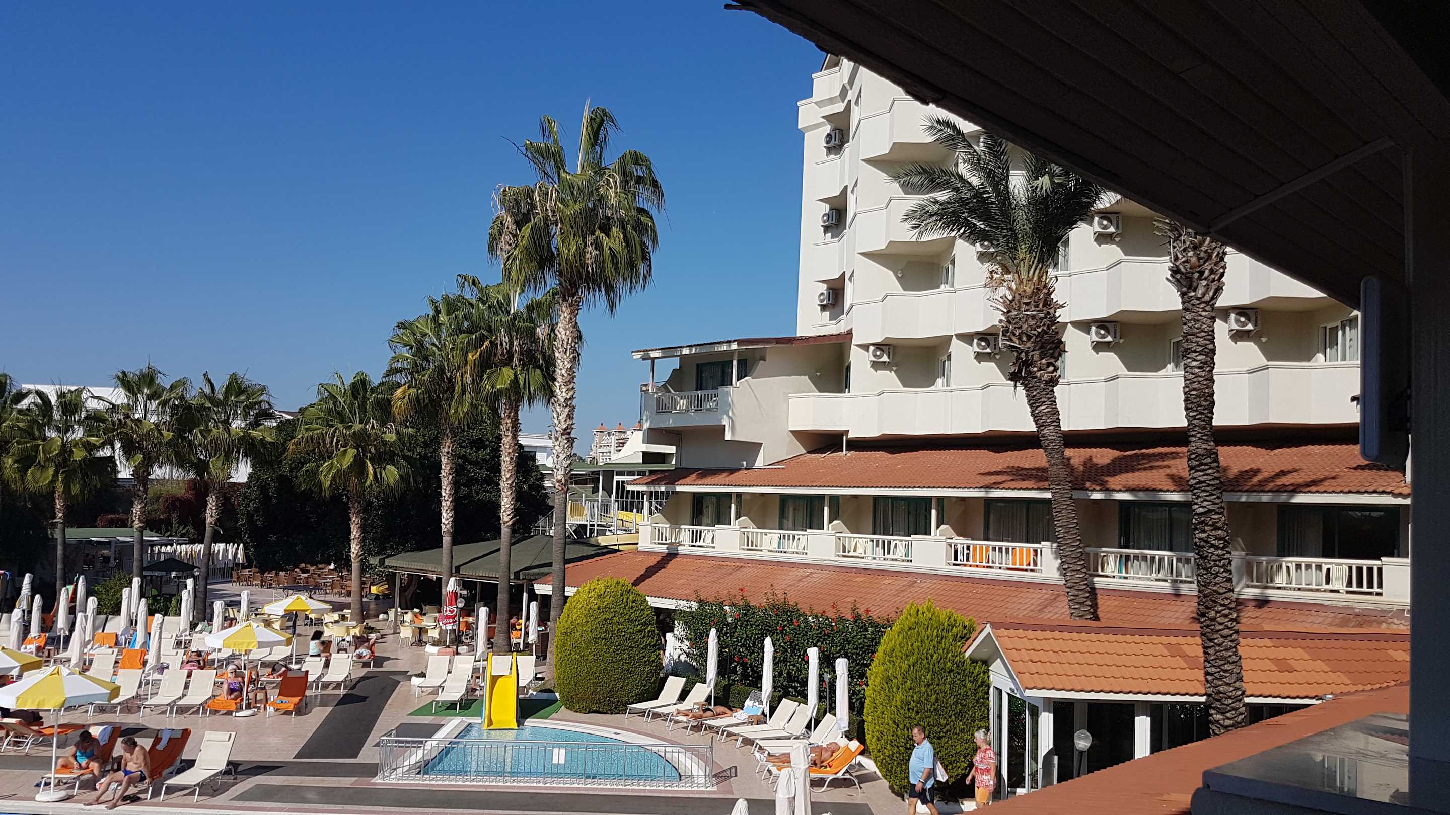 Ausblick erster EG auf Poolanlage und Poolbar