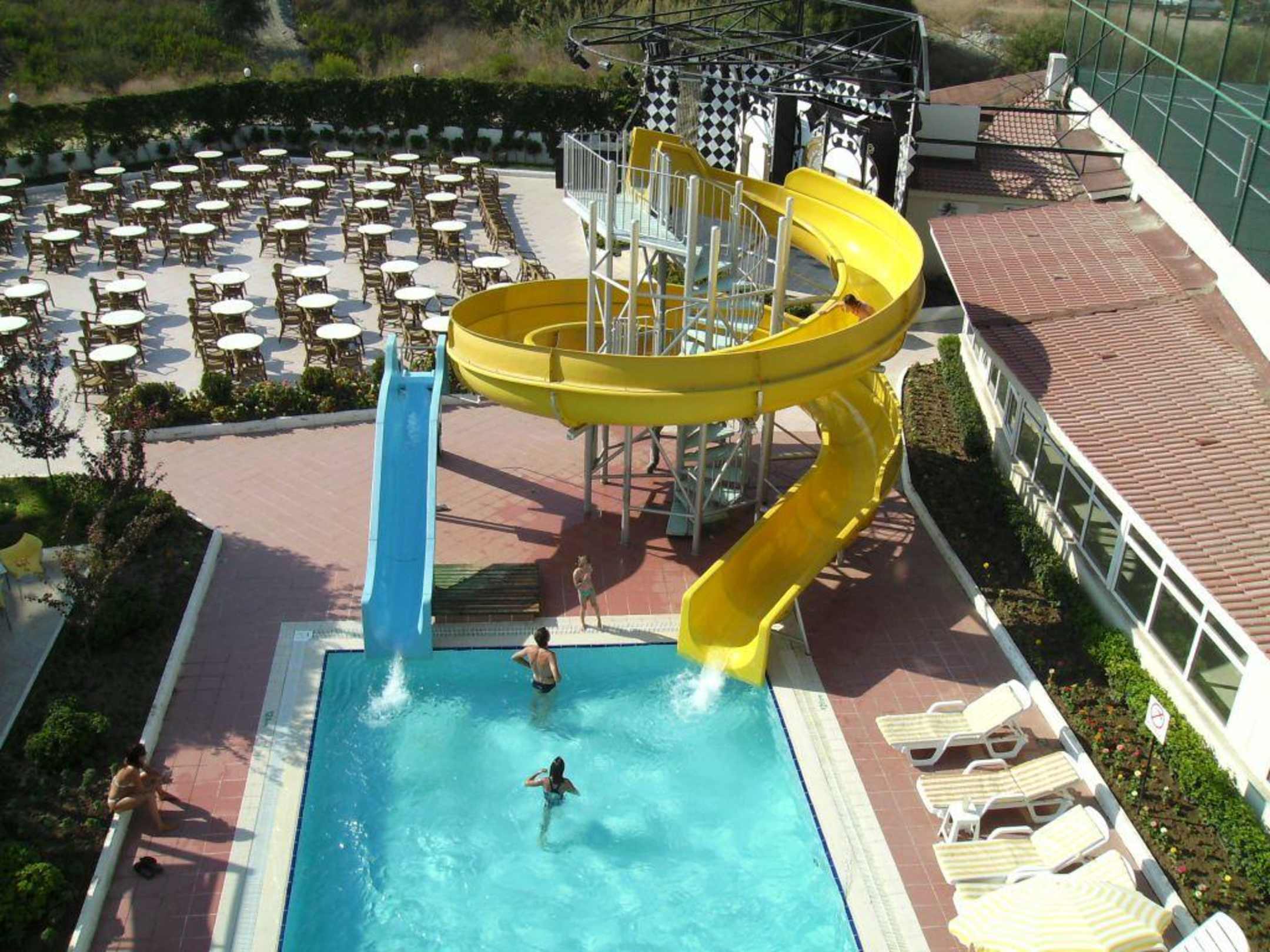 Blick auf Wasserrutsche und Bühne