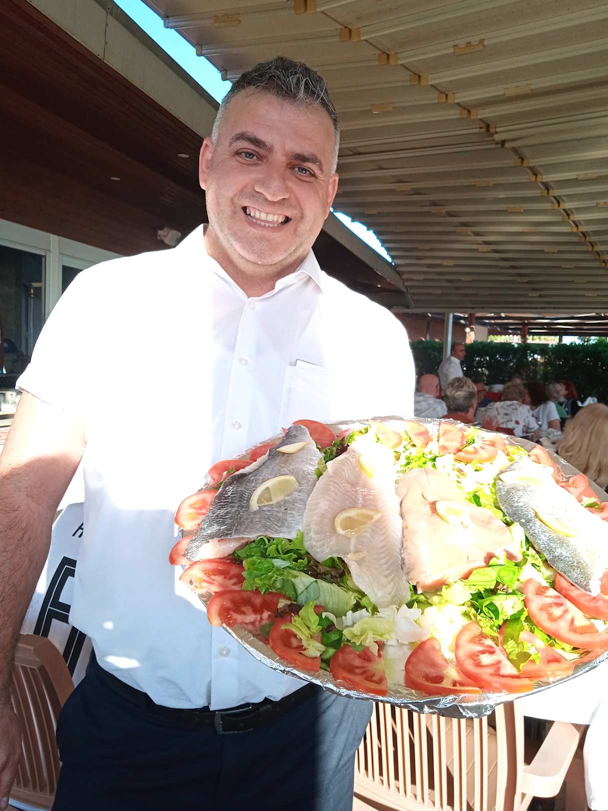 Das ist der Restaurant Chef Jusuf mit Fisch essen am Strand