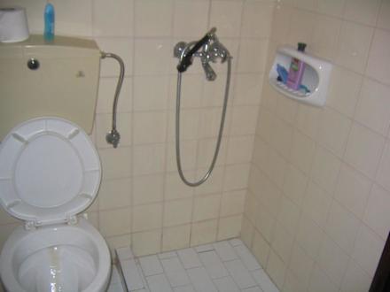 Hier sieht man die Dusche des Ferenikis. Kein Duschvorhang, nur ein Loch im Boden als Abfluss und keine Möglichkeit, die Dusche aufzuhängen.