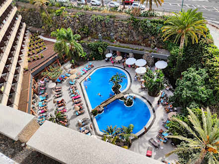 Blick von der Dachterasse auf den 1. Pool an der Lobby
