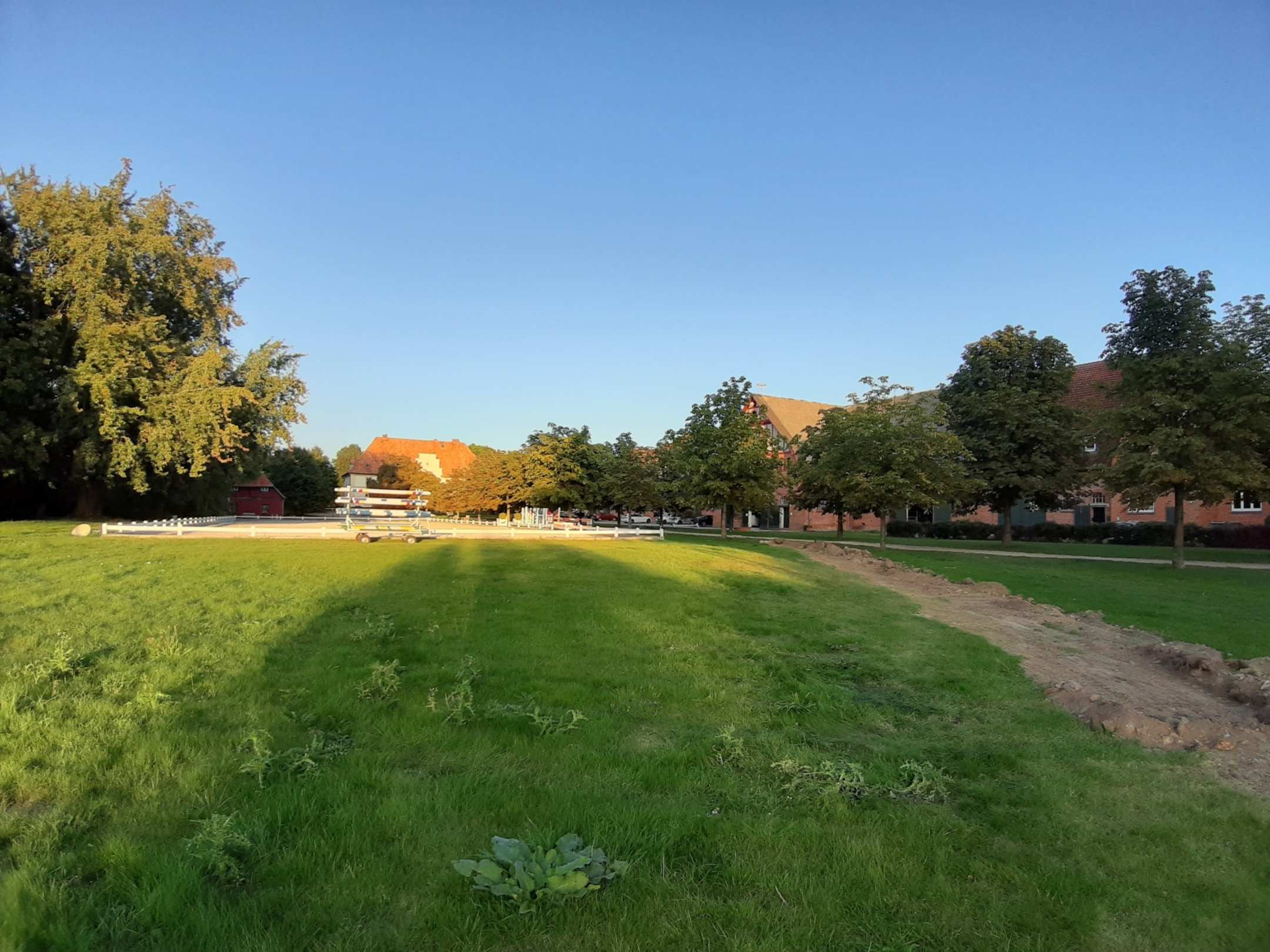 Blick Richtung Reitplatz, Gutshaus und Kornspeicher (rechts)