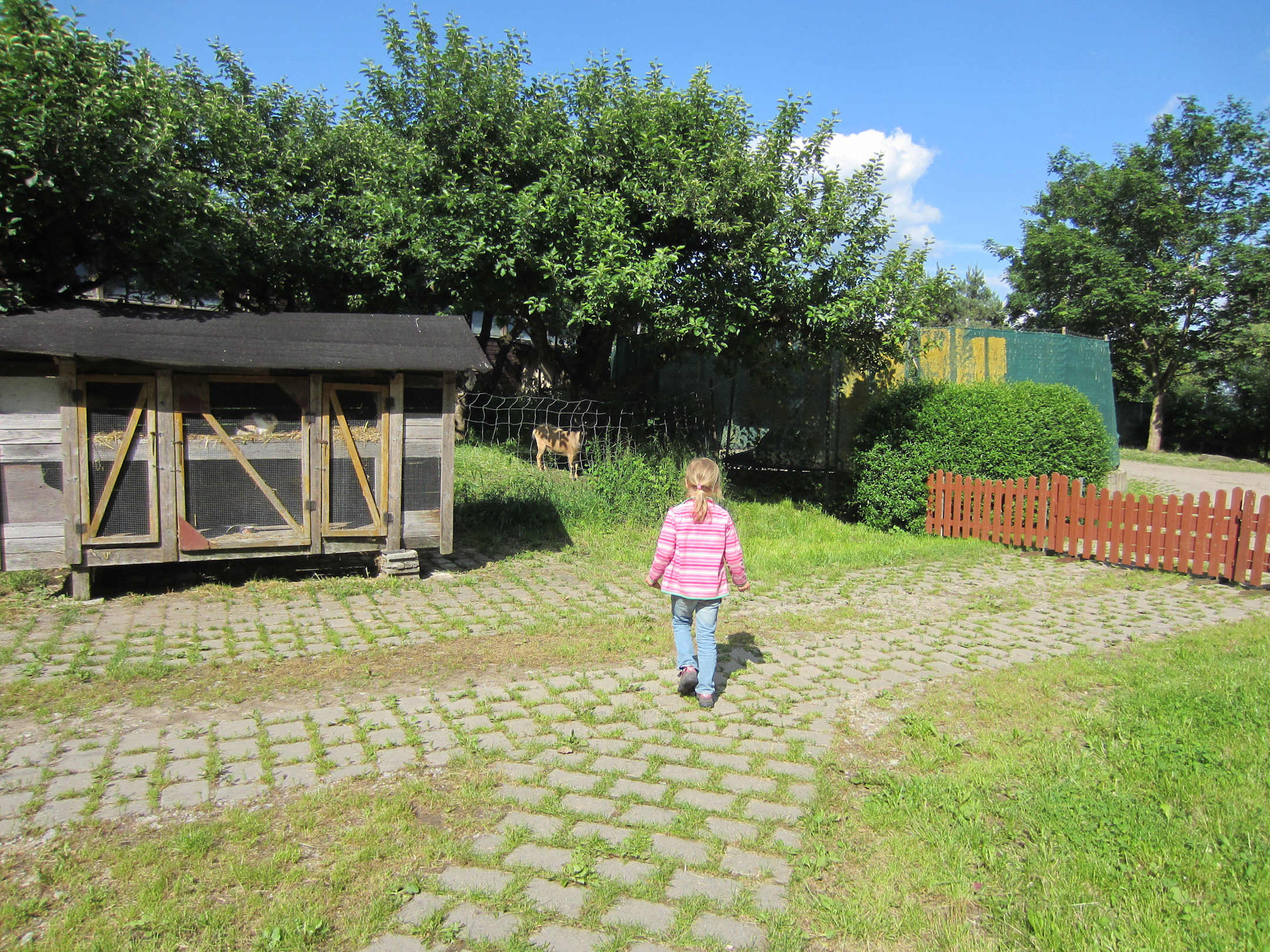 Rechts zu sehen ein mobiler Holzzaun, der bei Bedarf für kleine Kinder oder Hunde aufgestellt werden kann, damit sie nicht von alleine in Richtung Stall, Traktoren, etc. laufen, wo es unbeaufsichtigt für sie gefährlich werden könnte.
