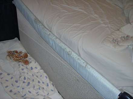 Babybett zum Zeitpunkt der Ankunft. Das Babybett wurde durch den Veranstalter vor Ort aufgebaut und uns kostenpflichtig zur Nutzung überlassen. Nach Beschwerde wude das Bett durch ein neues ausgetauscht