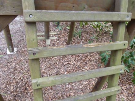 Hier sieht man die total verrottete Spielecke. Die Farbe ist abgeplatzt, Splitter stehen überall raus, das Holz ist morch, unter den Schaukeln steht eine Wurzel raus. Ich würde hier kein Kind spielen lassen.