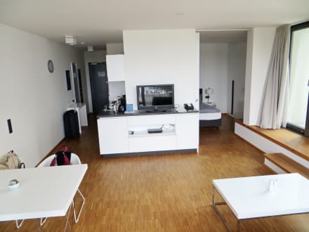 ZimmerBlick auf Fernsehboard. Eingang und Küchenzeilelinks, Schlafraum rechts (durch Schiebetür abtrennbar)