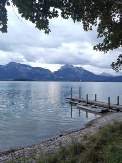 Blick vom Forggensee auf Schloss Neuschwanstein mit Gebirge