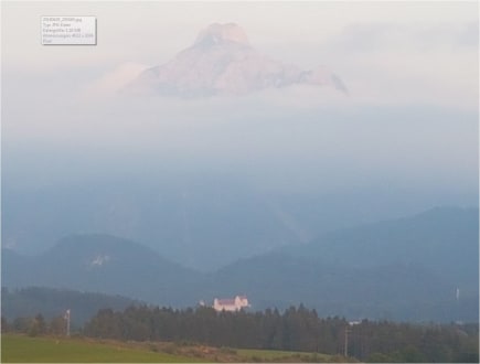 Panaoramblick vom Balkon auf das Füssener Schloss (Bildmitte), Schloss Neuschwanstein (links davon) und im Hintergrund den imposanten 2000 er Berg Säuling morgens im Nebel