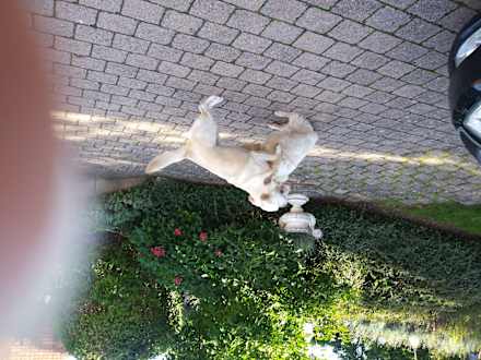 GartenanlageUnsere Hündin im fröhlichen Spiel mit dem Hund des Hauses, ein fünfjähriger Labrador, sehr freundlich!