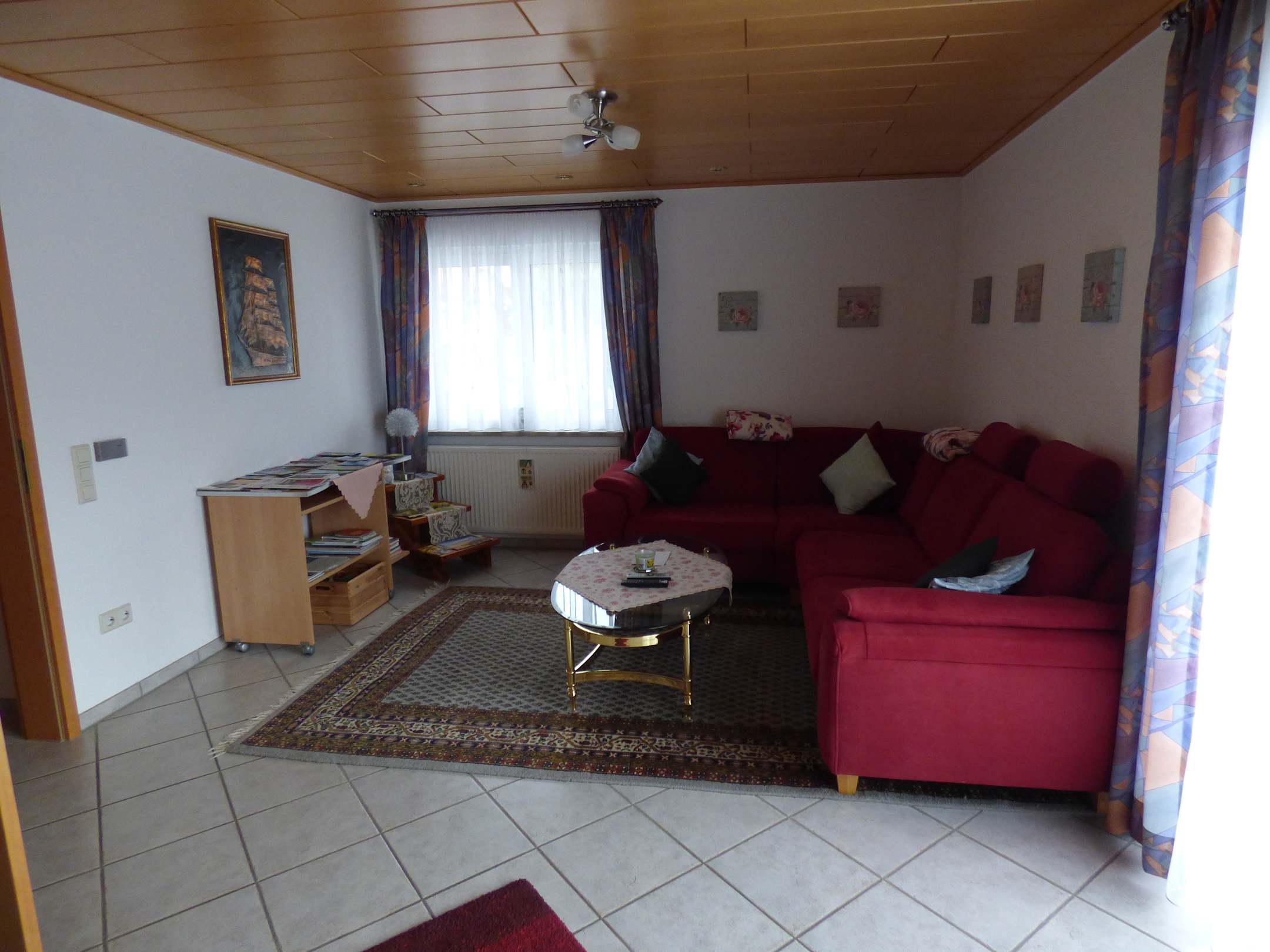 ZimmerBequeme Sitzgarnitur und auf dem Sideboard Informationsheftchen über die Gegend rund um Daisendorf und ihre Ausflugsmöglichkeiten.