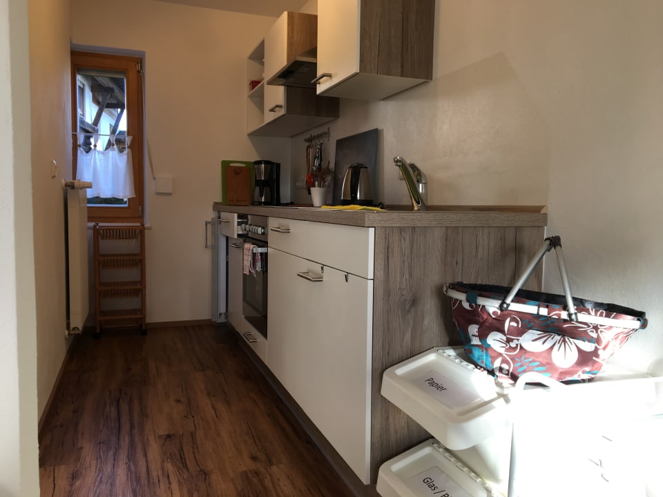 ZimmerKochnische in der FeWo Kaiserblick Brannenburg mit Spülmaschine, E-Herd, Dunstabzug, Fenster zum Lüften, Kaffeemaschine, Wasserkocher, Toaster, Kühlschrank mit TK-Fach, genügend Stauraum, Mülltrennsystem und allen Küchenutensilien, die man braucht