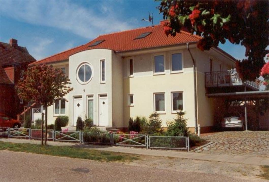 Aussenansicht der FW Becker. Oben rechts befinden sich die beiden FW. Im Rest des Hauses wohnt die Familie Becker selbst. Links vom Haus sind zwei Stellplätze für Autos.