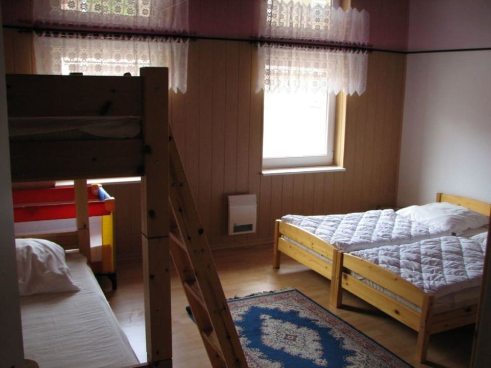 Kinder-SchlafzimmerSchlafzimmer für die Kinder in Mehrzimmerwohnung. Abgehängte gummiartige lilafarbene Decke ohne Lampen. Links Etagenbett, dahinter ein Kleinkindbett. Rechts zwei weitere Einzelbetten. Laminat. Hinten an der Wand Stromheizung (laut).