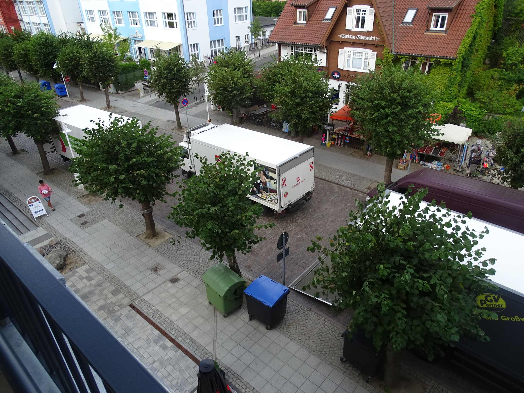 Gleich DREI Kühl-LKW mit laufendem Aggregat direkt und neben dem Balkon