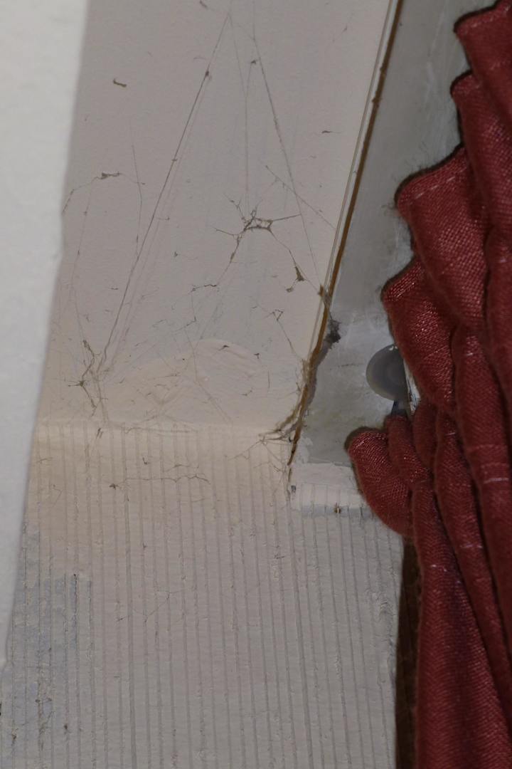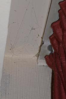 Spinnweben mit Nestern hinter den Vorhängen