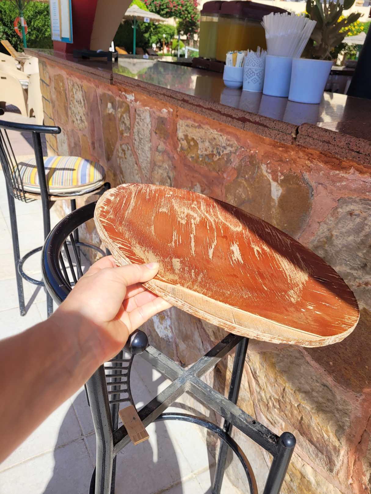 PoolNur ein Beispiel, so sehen die Barhocker an der Poolbar aus. Dieser desolate Zustand herrscht leider im ganzen Hotel. Haben den Manager darauf angesprochen, da es auch eine Gefahr birgt...ohne Reaktion. Auflagen für Stühle sehen nicht besser aus.