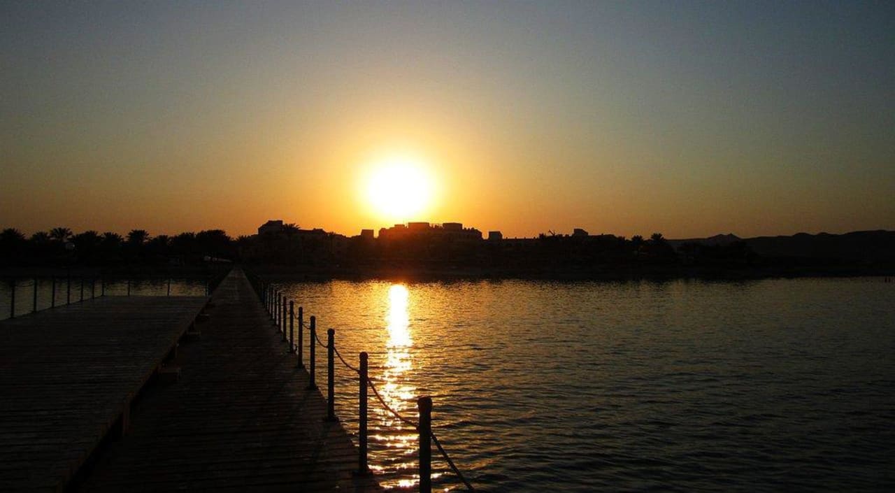 Sonnenuntergang vom Steg mit Blick auf das Hotel