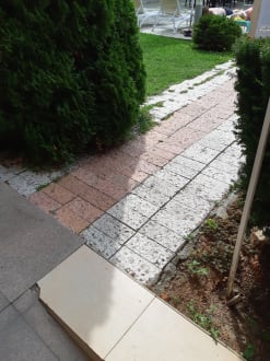 Ungepflegt, Unkraut überall in den Fugen.