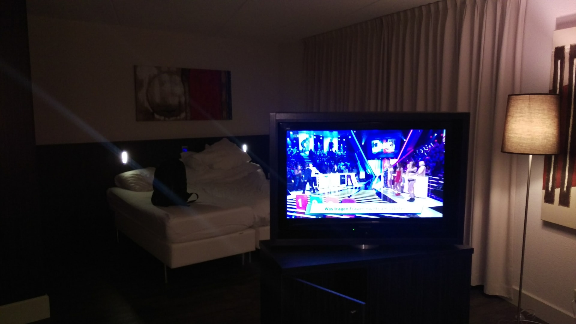 ZimmerDer TV war Drehbar. Wenn man Glück hatte konnte man RTL 15 Minuten sehen, danach gab es ständig Störungen und Empfangsabbrüche.