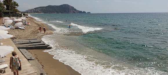 Nur Steine und Wellen, ohne Bade Schuhe keine Möglichkeit ins Wasser zu gehen. Wellen sind sehr laut da man nicht schlafen kann, und sehr gefährlich.