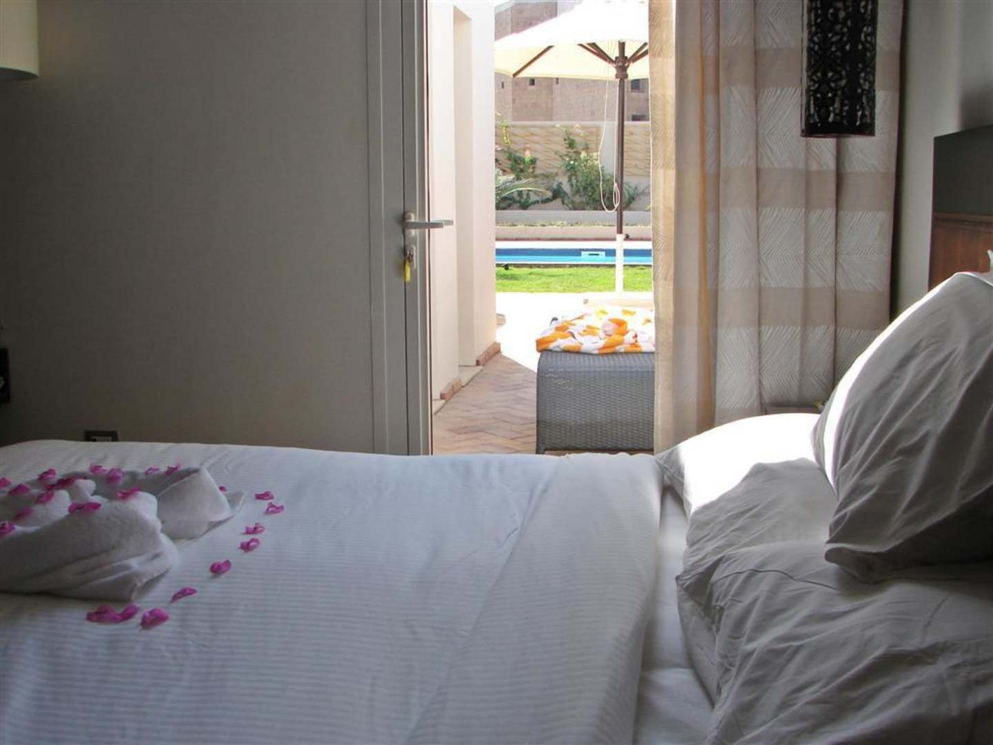 Blick vom Schlafzimmer zum Pool