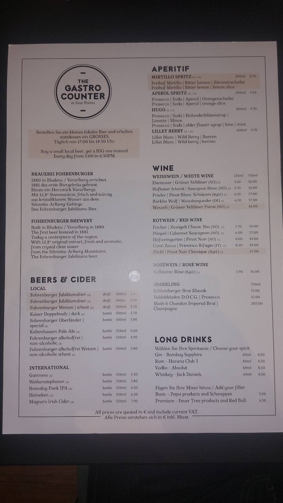Die Getränkekarte des Restaurants. Stand: Januar 2025.