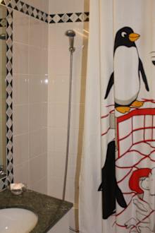 hinter dem lustigen Vorhang ist die Badewanne