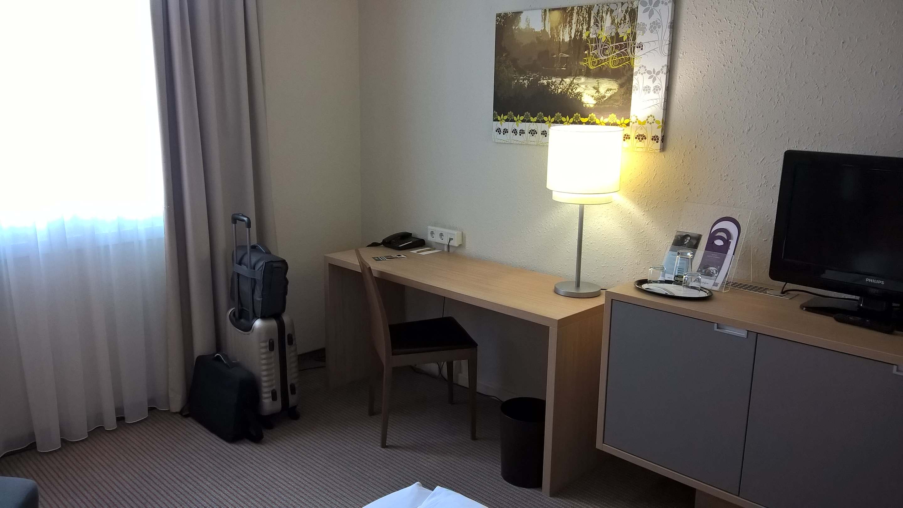 geräumiges Zimmer mit extra Schreibtisch und extra TV Anrichte. Darunter die Minibar.