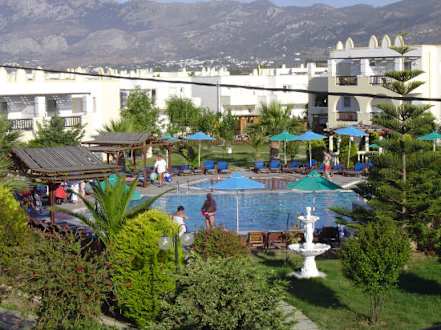 Blick vom Balkon auf den ersten Pool (alter Teil der Anlage).