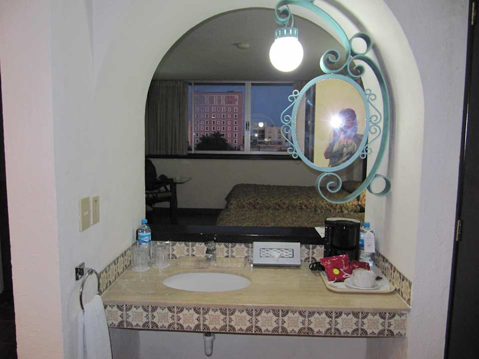 Waschtisch mit Blick auf das BettGegenüber von dem Waschtisch gelangt man in das Bad und rechts daneben befindet sich der große Kleiderschrank.