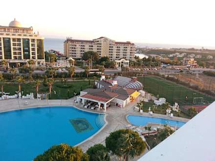 Aussicht vom Balkon auf Nachbarhotels und auf Pool