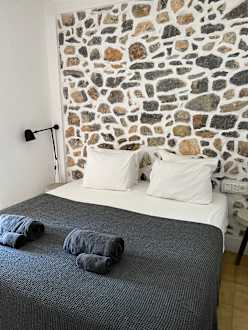 Bequemes Bett mit schöner Steinmauer