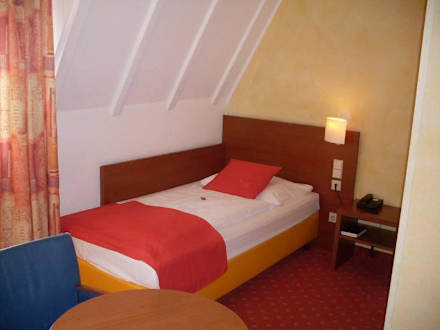 Bequemes BettBlick auf das Einzelbett eines Zimmers in der fünften Etage. Die Dachschräge ist erkennbar.