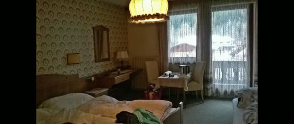 Großes Zimmer. Ein Doppel-und ein Einzelbett. Großer Balkon. TV ist vorhanden. Nicht im Bild ist der Eingangsbereich ins Zimmer mit Wandschrank.