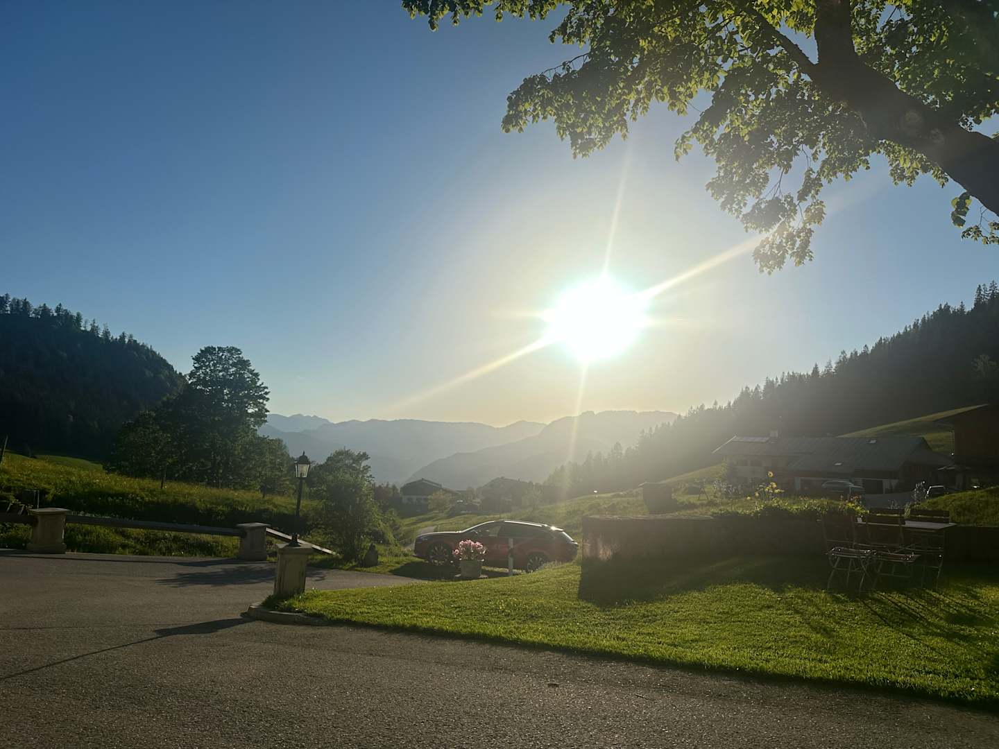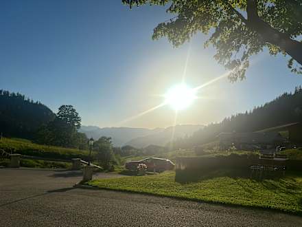Sitzmöglichkeiten um das Haus vorhanden. Man kann nach Berchtesgaden herunter schauen.