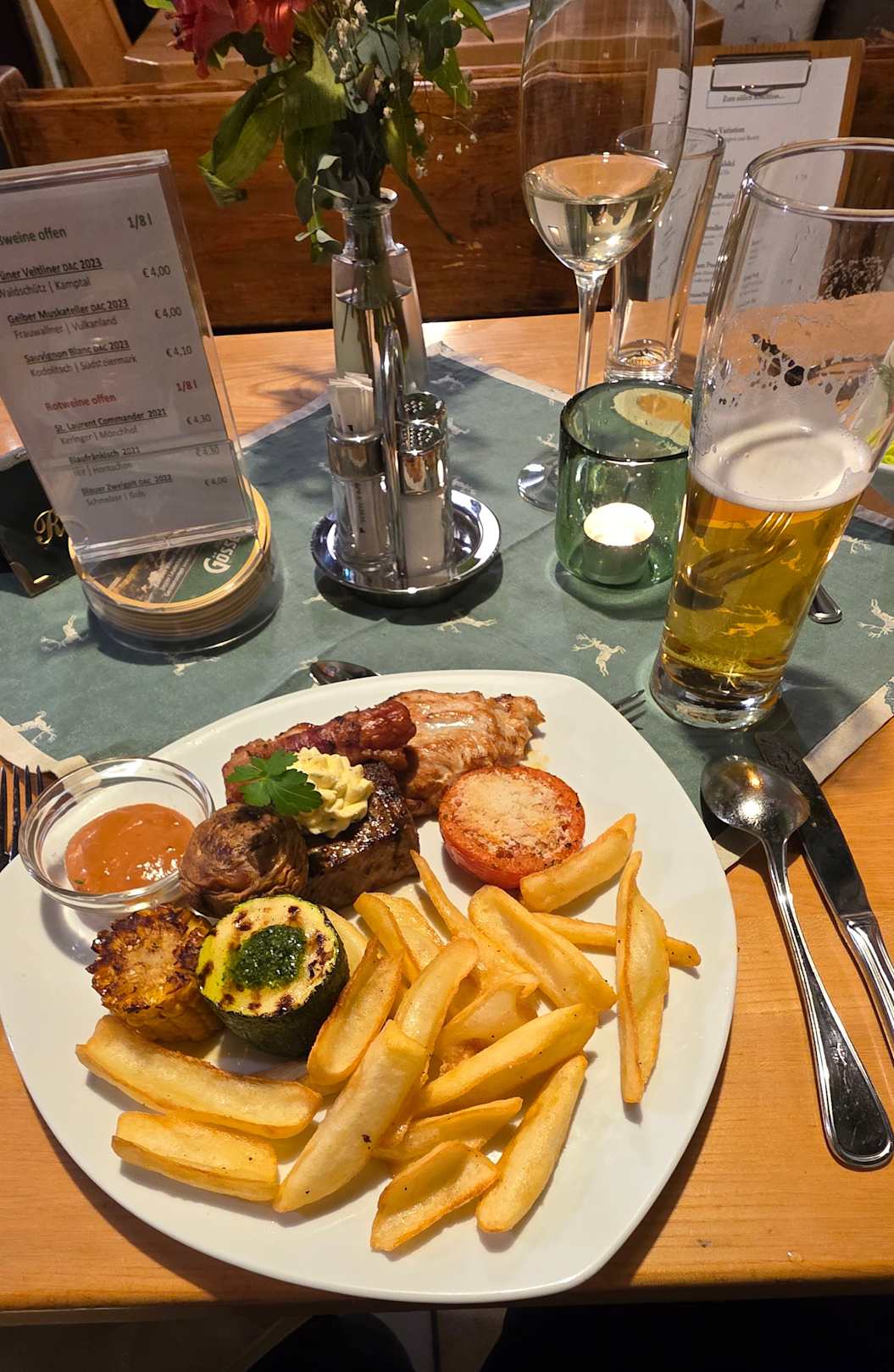 Ausgezeichneter Grill-Teller mit hausgemachten Pommes und gegrilltem Gemüse.
