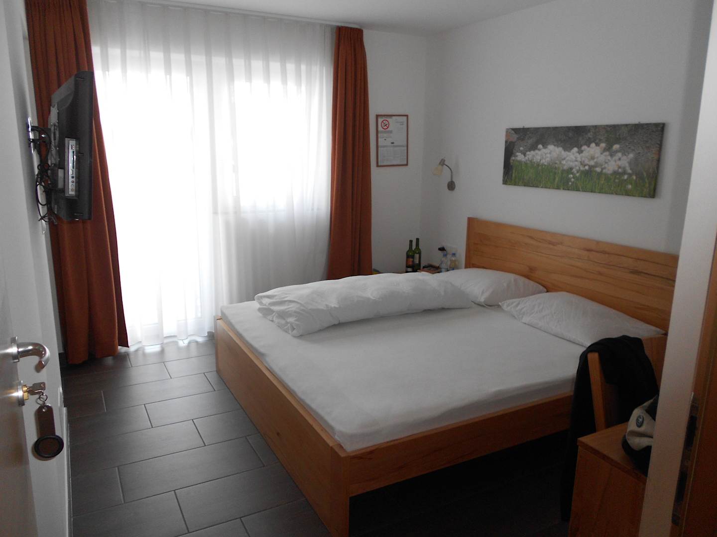 Doppelzimmer, geradeaus mit Terrasse, links Bad.