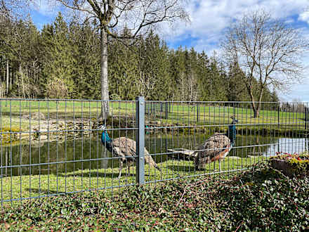 Anliegendes Gehege der Hühner (Frühstückseier) und Pfaue.
