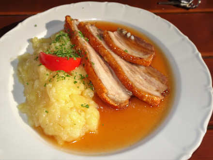 Krustenbraten vom Schweinewammerl mit hausgemachtem Kartoffelsalat im Gasthof Zur schönen Aussicht