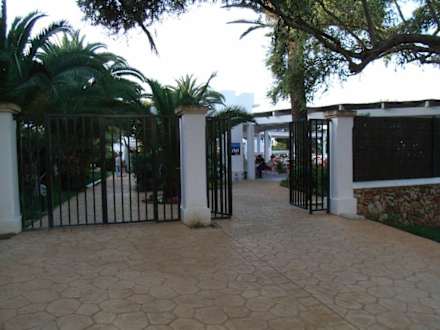 Das Gebäude Ariel Chico befindet sich hinter der Außenbühne.Links hinter der geschlossenen Gittertür ist der Gang zum Hotel und rechts befindet sich die Außenbar mit Bühne.